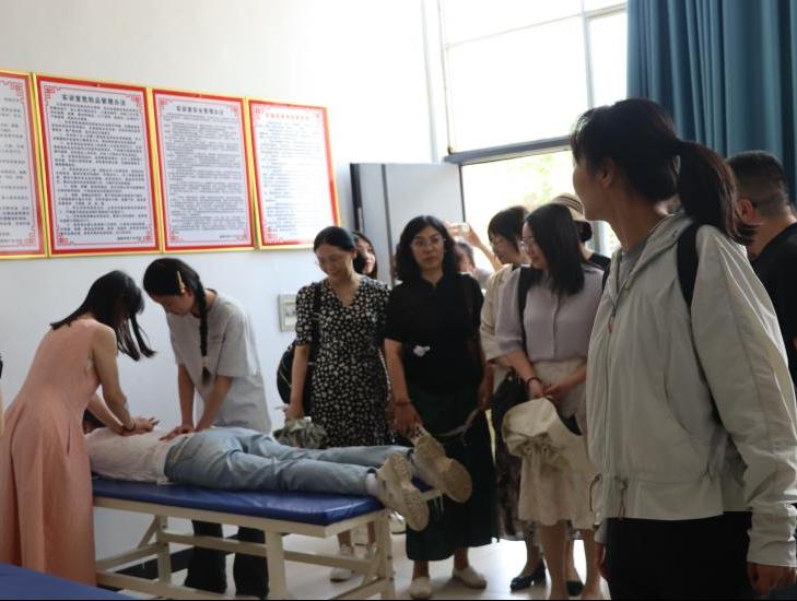 专家组一行实地考察了健康管理产业学院人体形态学实训室、急救室实训室、健康评估实训室、中医养生保健实训、中医针灸推拿实训室、中医药膳实训室、婴幼儿保健实训室等实训教学场地。该院负责人详细介绍了产业学院的办学方向、专业建设情况以及实训室的设备功能、教学模式及学生实践成果,展示了健康管理产业学院“理论+实践+产业应用”的一体化培养体系。专家组对中医药膳等特色项目给予了充分肯定,认为这对当地的康养产业的发展有着十分积极的推动作用。中医2023级学生现场展示了推拿按摩实训课场景,受到了专家组的一致好评。