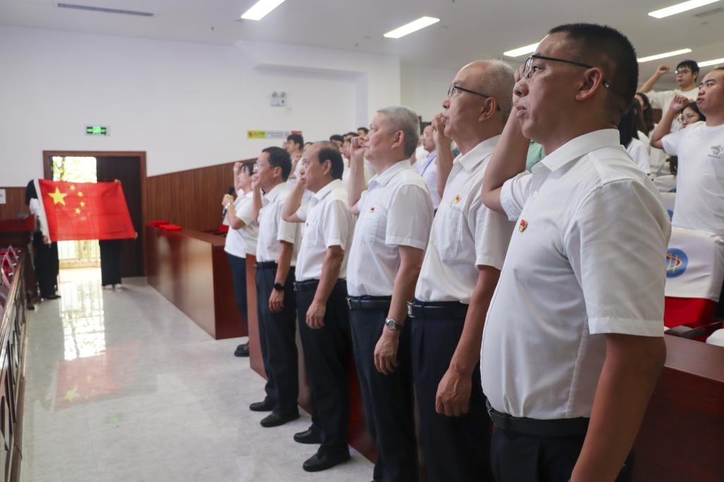 大会在庄严的国歌声中启幕。全体师生肃立高唱国歌,嘹亮旋律饱含爱国热忱。随后,全体教师举行履职宣誓仪式。在领誓人马小林带领下,教师们面向国旗,高举右拳,庄严承诺忠诚党的教育事业、恪守职业道德、履行教书育人职责,彰显教育初心与使命担当。