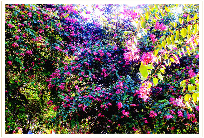 道路边、花园里,教室四周随处可见枝繁叶茂的紫荆树,它们不但翠绿,而且生机勃勃。在茂密葱笼的枝叶间,紫荆花一串串挂满枝头,有尖尖的花包,有即将绽放的花骨朵,更有舒展绽放的花瓣,偶尔还能看见小蜜蜂在花中采蜜呢!一眼望去,一派繁花似锦,俨然一幅美丽的画卷,让人流连忘返。