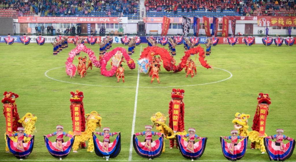 11月2日晚,2025\2026四川城市足球联赛(川超)川西赛区攀枝花VS乐山主场赛事在攀枝花市体育中心鸣哨开战。我校近400名学子以饱满的热情、昂扬的姿态和精湛的表演,将米易绚丽多姿的民族风情和厚重悠久的非遗文化以精美的艺术形式展现在现场观众面前,为“川超”呈现了热情攀枝花的又一种美丽,为热烈的赛事氛围增添了浓墨重彩的一笔,为这场体育盛会注入了浓郁的文化气息与青春活力,圆满完成了赛事开场及中场环节的演出任务,赢得了现场观众、主办方及社会各界的高度赞誉。