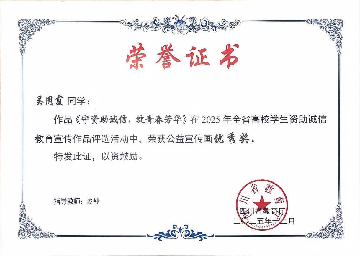 12月5日,由四川省教育厅、中国人民银行四川省分行联合主办的2025年全省高校学生资助诚信教育宣传作品征集评选结果揭晓。我校博讯产业学院学生吴周霞凭借主题鲜明、情感真挚的原创作品,从全省613件参赛作品中脱颖而出,荣获优秀奖,为学校赢得荣誉。