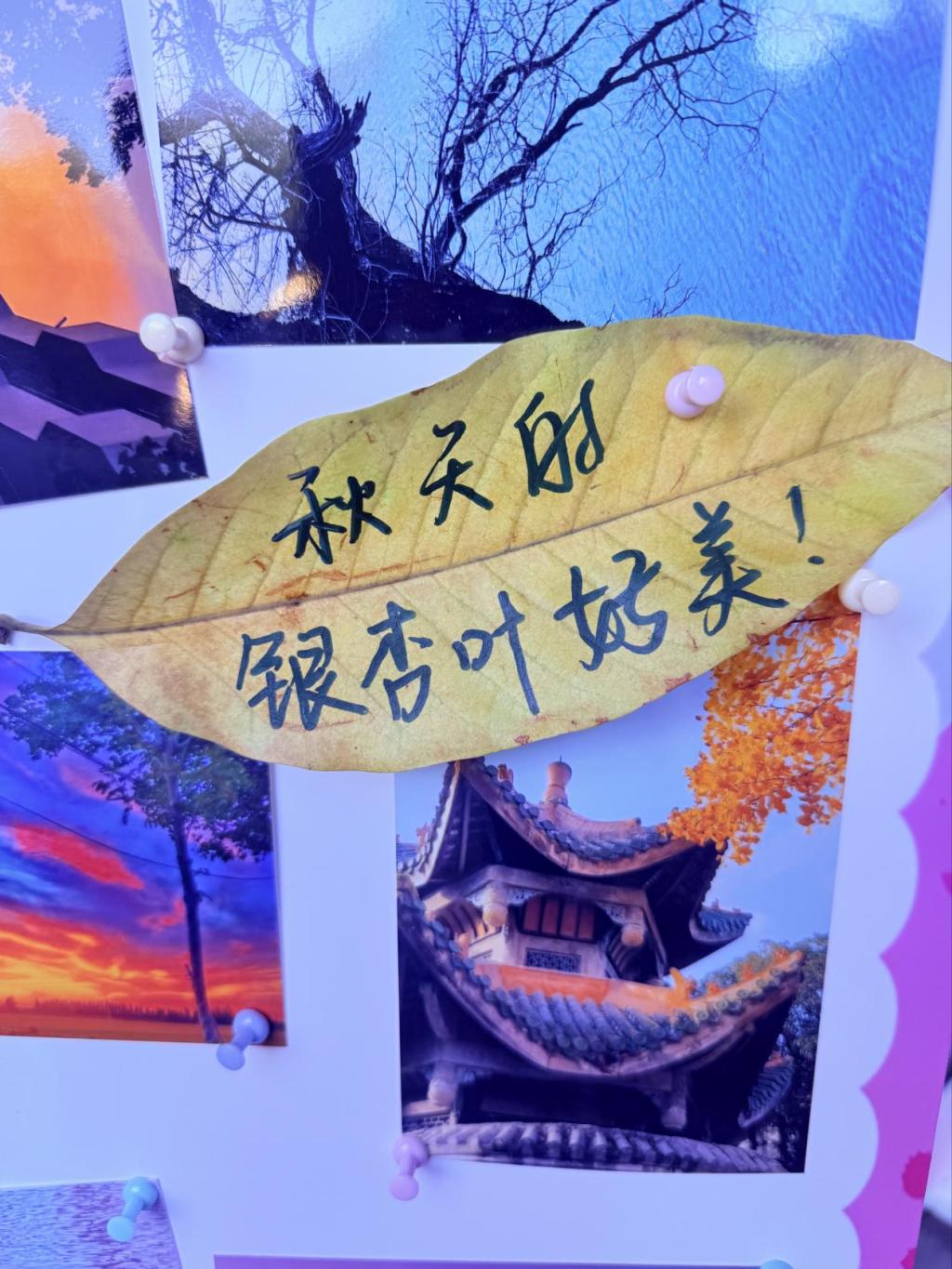 展览现场,色彩斑斓的摄影作品沿展区长廊依次陈列,有些作品都附有参观者的“心灵寄语”,表达参观后的喜悦与感悟。在一张银杏叶的风景照片下,有参观者留言”秋天的银杏叶好美”传达了对照片的欣赏。此外,心理咨询室还在现场设置了 “心灵签名墙”,参观师生可以留下自己的名字或自己想说的话,形成了以影传情、以言暖心的良好氛围。