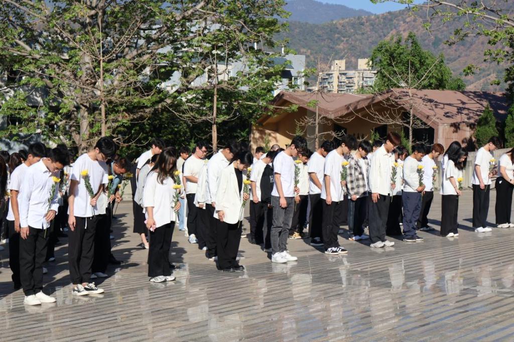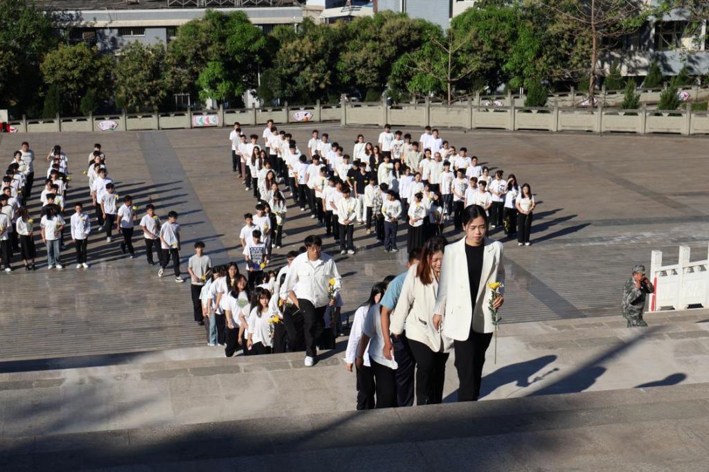 默哀礼结束后,全体人员在老师们的带领下,手持鲜花,表情庄重肃穆,迈着整齐而沉重的步伐,向着烈士纪念碑缓缓前行,依次向烈士敬献鲜花,寄托对先烈们的深切哀思。
