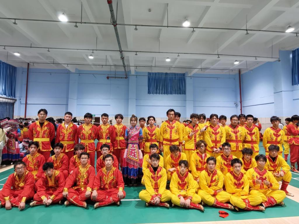 开幕式上,伴随着激昂的鼓点,新能源与智能产业学院学生组成的龙狮队率先登场。红黄两色龙身穿梭腾跃,时而“金龙盘柱”,时而“蛟龙探海”,动作刚劲有力又不失灵动;憨态可掬的雄狮踩着节拍“踩球吐福”“雄狮献瑞”,每一个细节都展现出扎实的功底。随后,米易非遗展演环节温情上演,同学们身着傈僳族传统服饰,随着葫芦笙的悠扬旋律跳起《斑鸠吃水》,服饰上的非遗刺绣纹样在灯光下熠熠生辉,将米易傈僳族非遗文化的独特魅力展现得淋漓尽致。创意编排中,同学们还巧妙融入队形变换,以肢体语言勾勒出文化传承与青春活力的交融图景,为赛场注入了浓厚的本土文化气息。