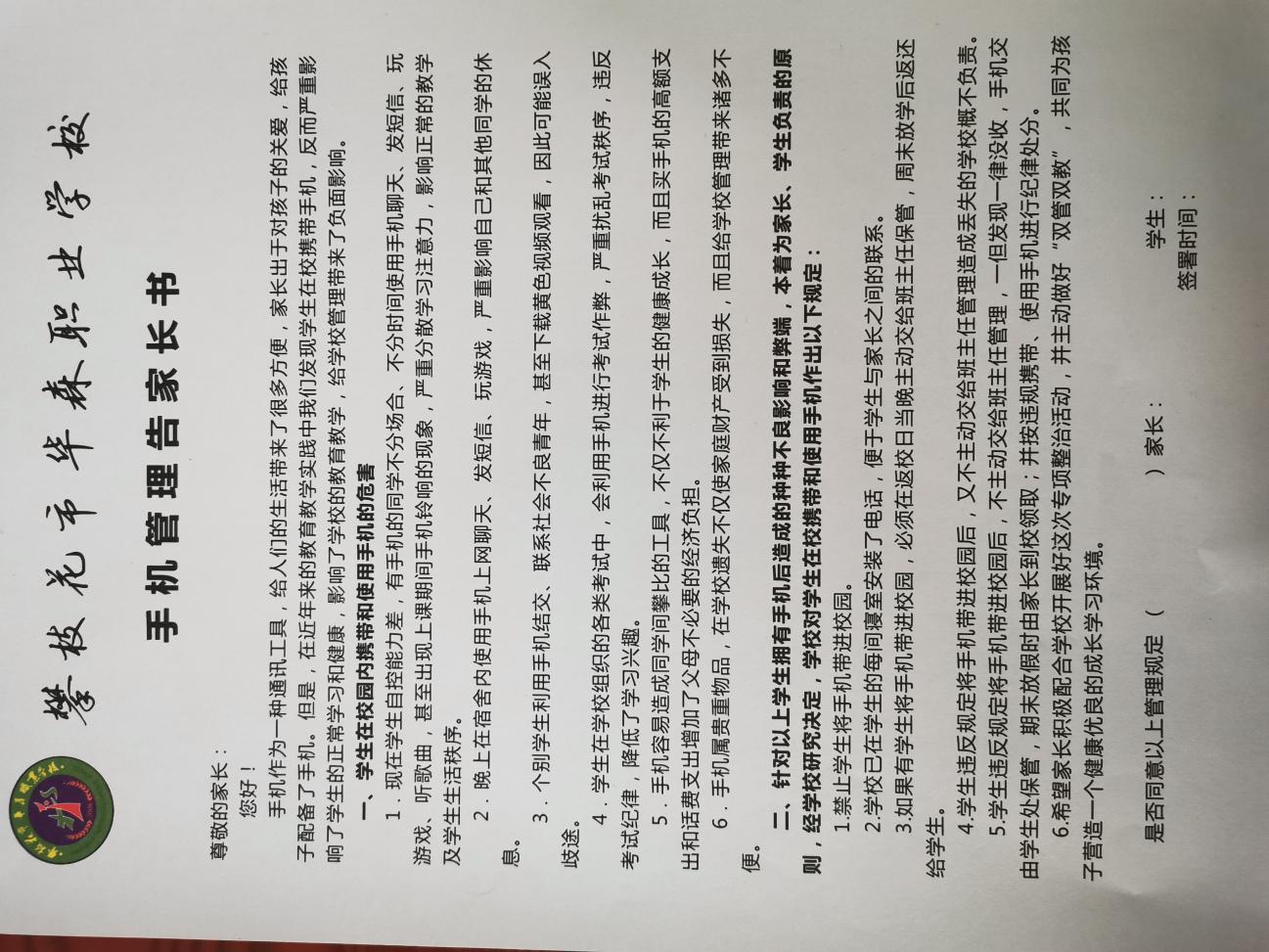4. 学生违反规定将手机带进校园后,又不主动交给班主任管理造成丢失的学校概不负责。